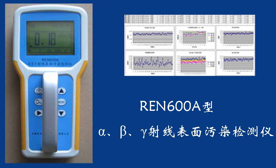 REN600A 表面沾污檢測儀REN600A型α、β、γ射線表面污染檢測儀即可檢測α、β、γ射線,也能檢測到X射線,它采用高速嵌入式微處器作為數(shù)據(jù)處理單元,點陣式大屏幕LCD液晶顯示,讀數(shù)清晰、操作方便,具有400條超大容量數(shù)據(jù)存儲。儀器采用進口的大面積MICA蓋革探測器,具有較高探測效率,可進行α、β輻射表面污染檢測和X、γ輻射劑量率的監(jiān)測。此外通過配套的RenriCont表面污染管理軟件可將存儲的數(shù)據(jù)讀出后分析?蓮V泛用在制藥廠、實驗室、發(fā)電廠、進出口商檢、采石場、環(huán)境實驗室、環(huán)境污染調查、核安全應急、緊急狀況營救站、金屬處理廠、地下油田、供油管道裝備、醫(yī)院核醫(yī)學科、同位素實驗室、環(huán)境保護和警察局等部門。REN600A型α、β、γ射線表面